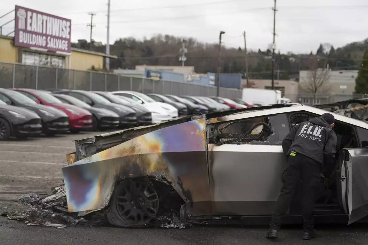 FILE - A member of the Seattle Fire Department inspects a burned Tesla Cybertruck at a Tesla lot in Seattle on March 10, 2025. (AP Photo/Lindsey Wasson, File)