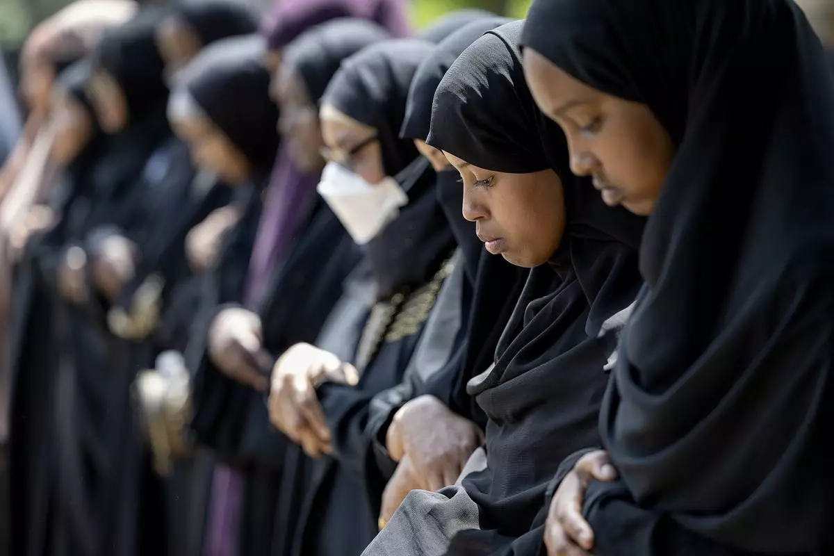 FILE - Women line up in prayer during the funeral for five women, Salma Abdikadir, Siham Adam, Sabiriin Ali, Sahra Gesaade and Sagal Hersi, who were killed in a car crash on Lake Street, at the Dar Al-Farooq Islamic Center in Bloomington, Minn., on Monday, June 19, 2023. (Elizabeth Flores/Star Tribune via AP, File)
