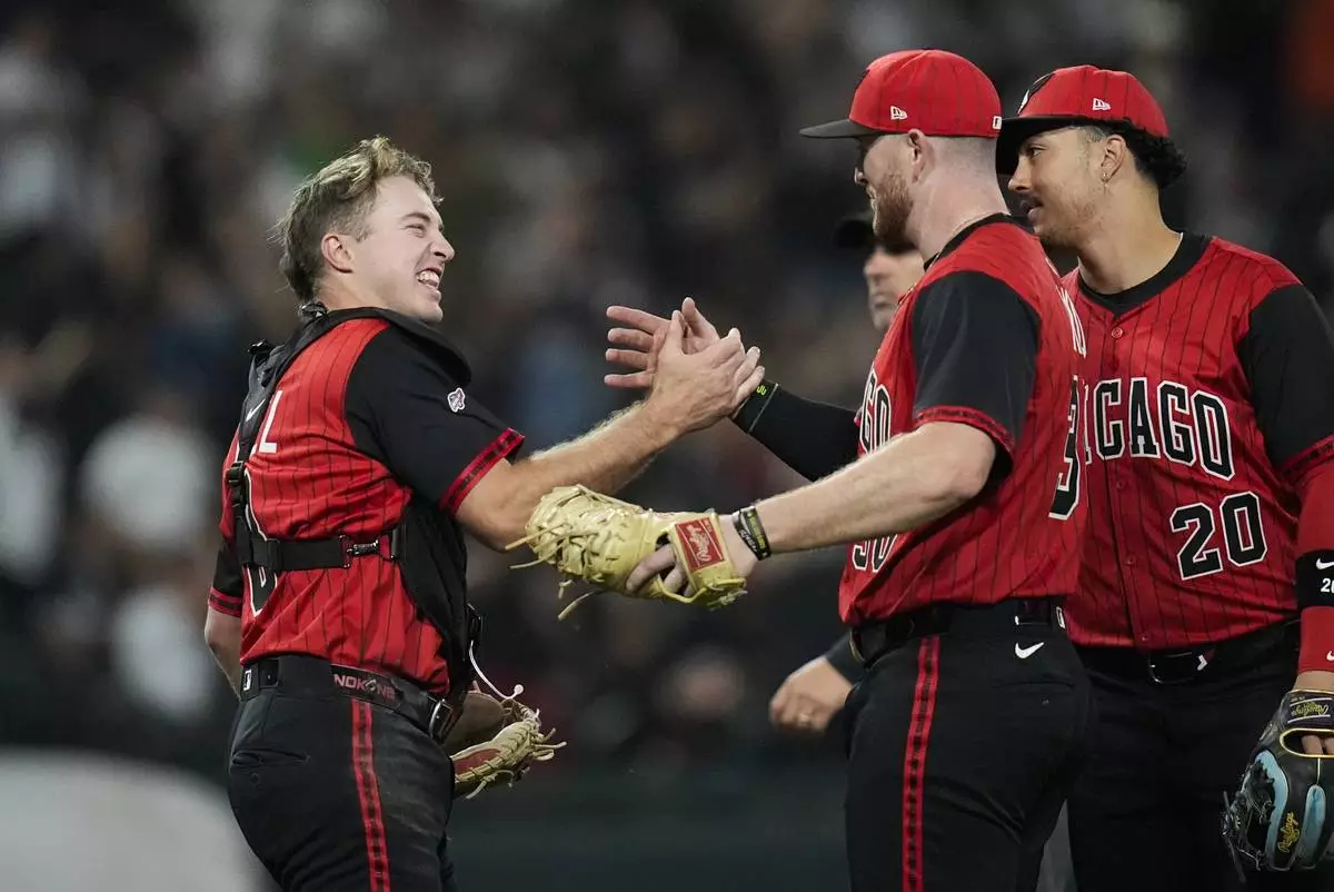 Chicago White Sox catcher Kyle Teel (8), left, and first baseman Tim Elko (30) celebrate their team's win over the Kansas City Royals in a baseball game Friday, June 6, 2025, in Chicago. (AP Photo/Erin Hooley)