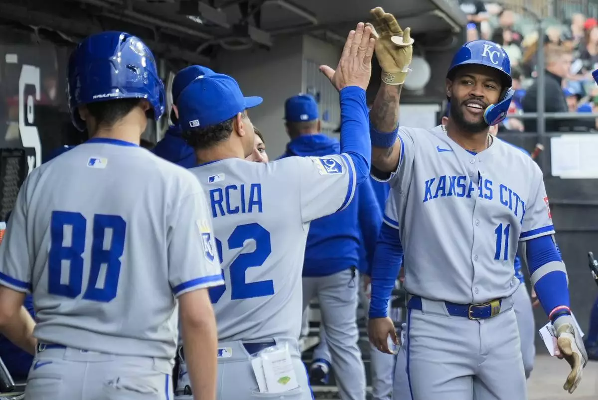 Kansas City Royals' Maikel Garcia (11) celebrates his home run during the third inning of a baseball game against the Chicago White Sox, Friday, June 6, 2025, in Chicago. (AP Photo/Erin Hooley)