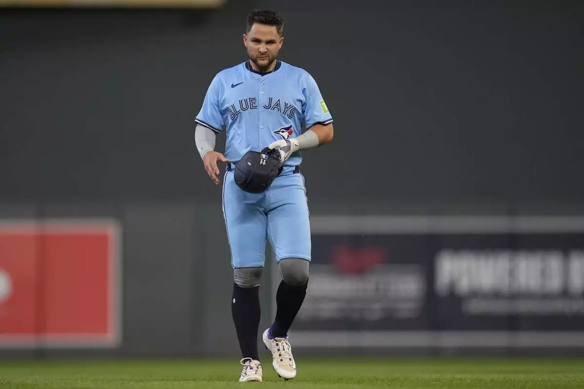 Toronto Blue Jays' Bo Bichette (11) walks back to the dugout after being caught stealing second base during the seventh inning of a baseball game against the Minnesota Twins, Friday, June 6, 2025, in Minneapolis. (AP Photo/Abbie Parr)