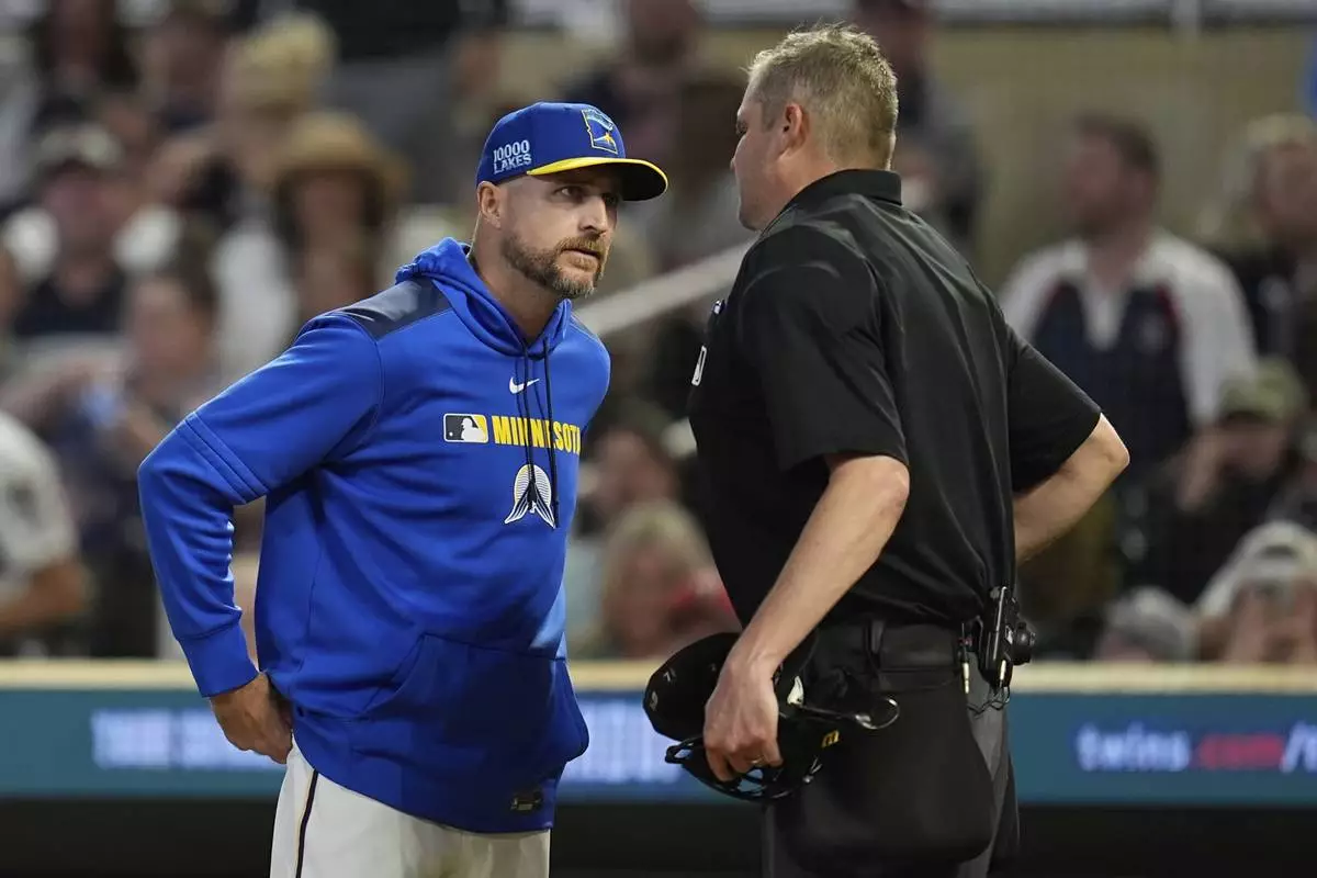 Minnesota Twins manager Rocco Baldelli (5) talks with home plate umpire Jordan Baker after a strike three call on Minnesota Twins' Ryan Jeffers (27) during the eighth inning of a baseball game against the Toronto Blue Jays, Friday, June 6, 2025, in Minneapolis. (AP Photo/Abbie Parr)