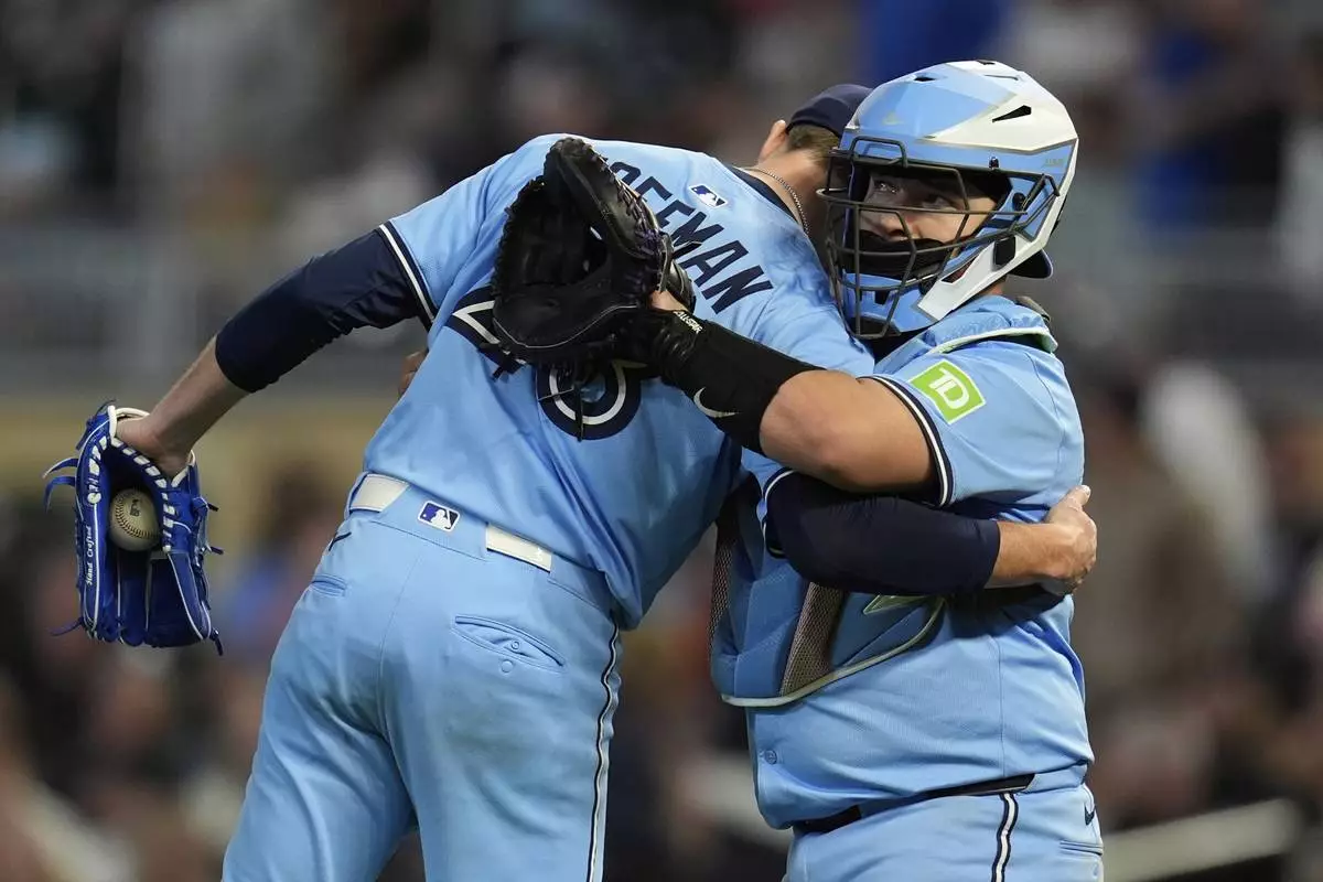 Toronto Blue Jays relief pitcher Jeff Hoffman (23), left, and catcher Alejandro Kirk (30) hug after a baseball game against the Minnesota Twins, Friday, June 6, 2025, in Minneapolis. (AP Photo/Abbie Parr)