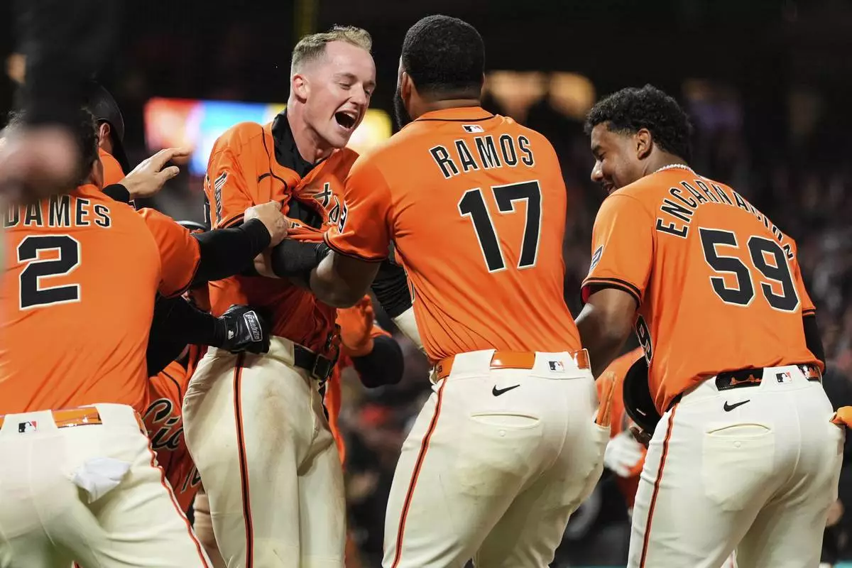 San Francisco Giants' Tyler Fitzgerald, center left, is mobbed by teammates after scoring the game-winning run on a wild pitch thrown by Atlanta Braves pitcher Pierce Johnson during the 10th inning of a baseball game Friday, June 6, 2025, in San Francisco. (AP Photo/Godofredo A. Vásquez)