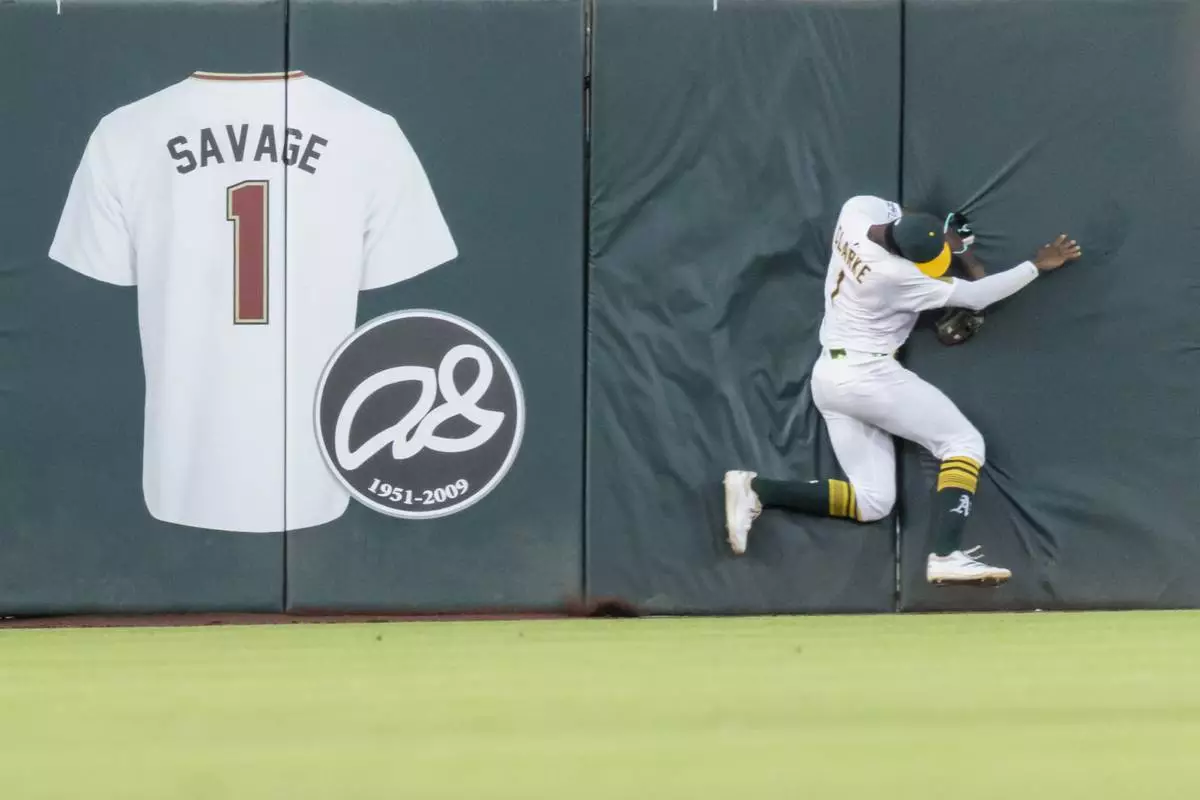Athletics outfielder Denzel Clarke collides into the wall after making the catch during the fourth inning of a baseball game against the Baltimore Orioles Friday, June 6, 2025, in West Sacramento, Calif. (AP Photo/Sara Nevis)
