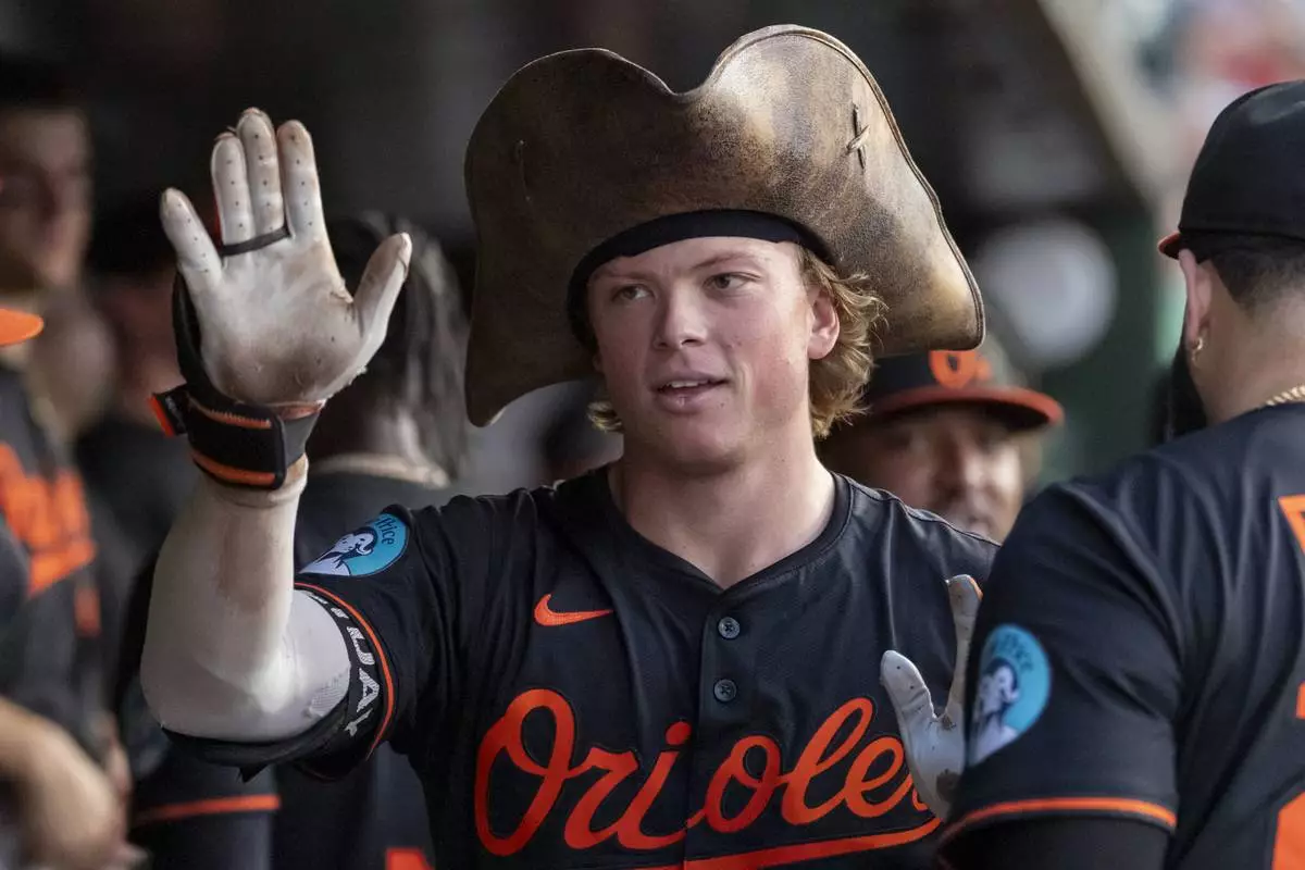 Baltimore Orioles' Jackson Holliday celebrates in the dugout after a solo home run during the fifth inning of a baseball game against the Athletics Friday, June 6, 2025, in West Sacramento, Calif. (AP Photo/Sara Nevis)