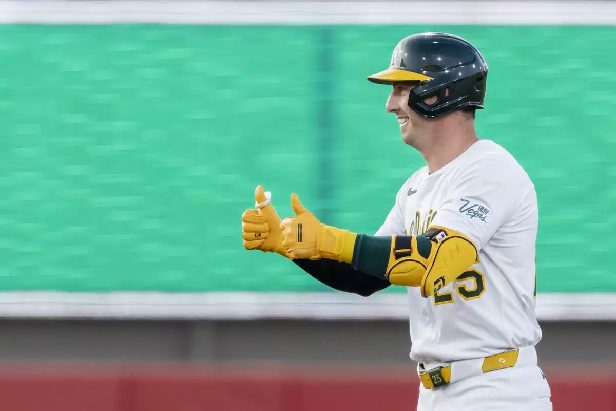 Athletics' Brent Rooker gives a thumbs up to the dugout after hitting a double during the third inning of a baseball game against the Baltimore Orioles Friday, June 6, 2025, in West Sacramento, Calif. (AP Photo/Sara Nevis)