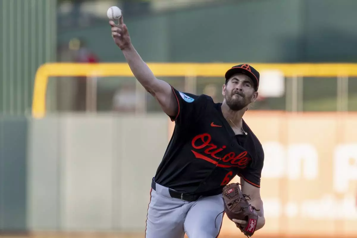 Baltimore Orioles pitcher Dean Kremer throws to the Athletics during the first inning of a baseball game Friday, June 6, 2025, in West Sacramento, Calif. (AP Photo/Sara Nevis)