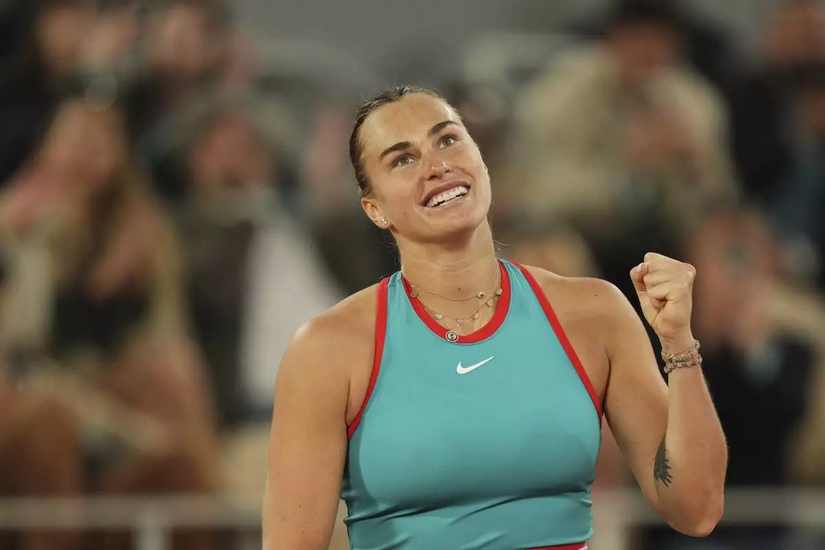 Aryna Sabalenka of Belarus celebrates as she won the semifinal match of the French Tennis Open against Poland's Iga Swiatek at the Roland-Garros stadium in Paris, Thursday, June 5, 2025. (AP Photo/Thibault Camus)