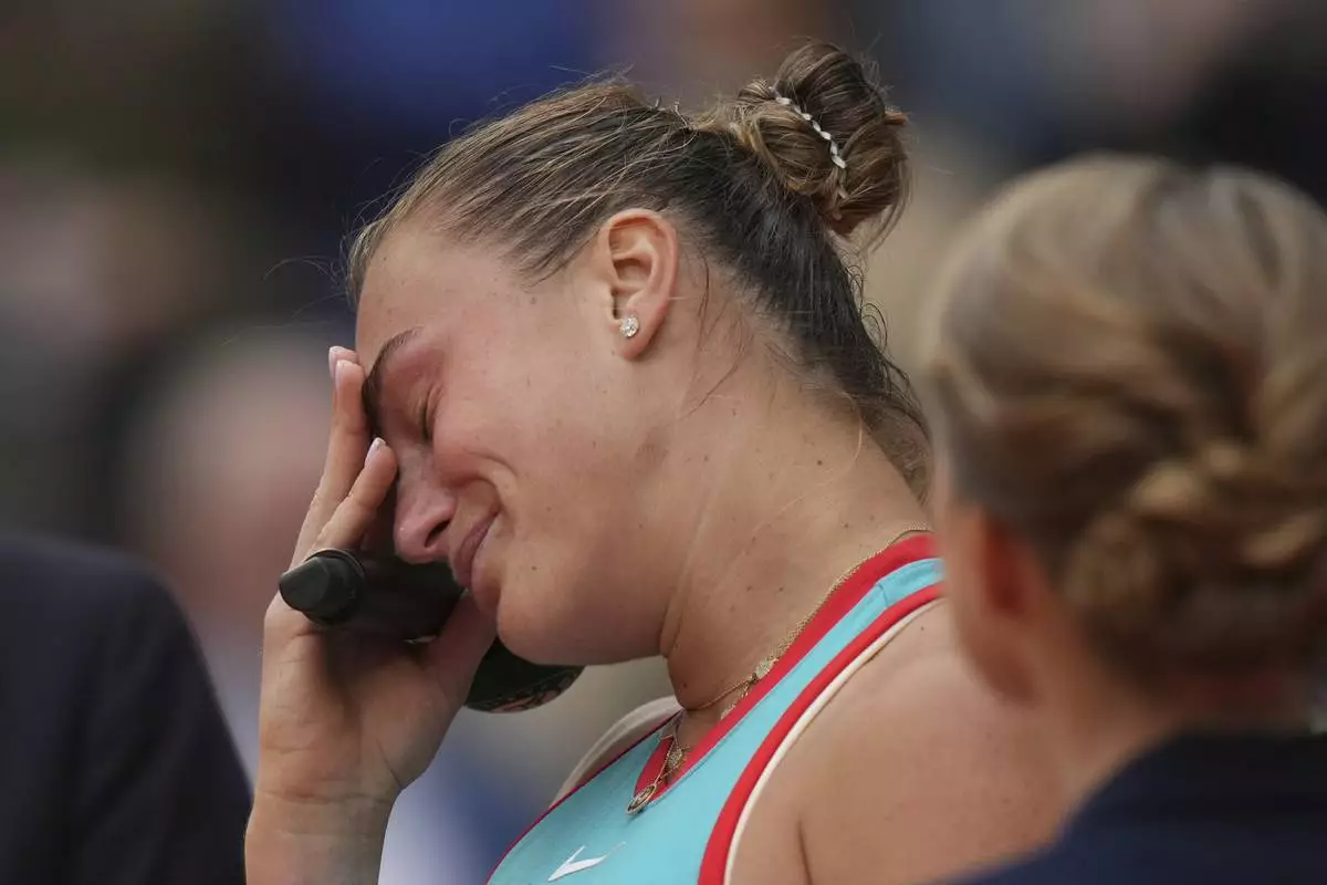 Aryna Sabalenka of Belarus cries during trophy presentation after losing the final match of the French Tennis Open at the Roland-Garros against United States' Coco Gauff in Paris, Saturday, June 7, 2025. (AP Photo/Thibault Camus)