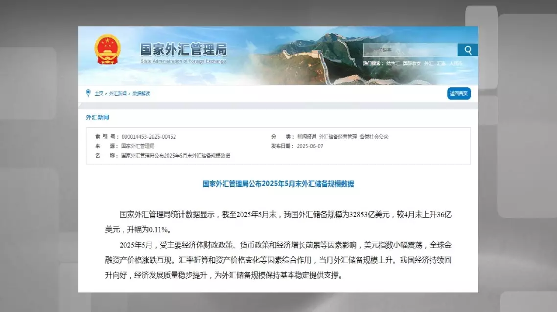 China's foreign exchange reserves totaled 3.2853 trillion U.S. dollars at the end of May 2025, up by 36 billion U.S. dollars, or 0.11 percent, compared with the end of April, according to a statement released by China's State Administration of Foreign Exchange on Saturday.