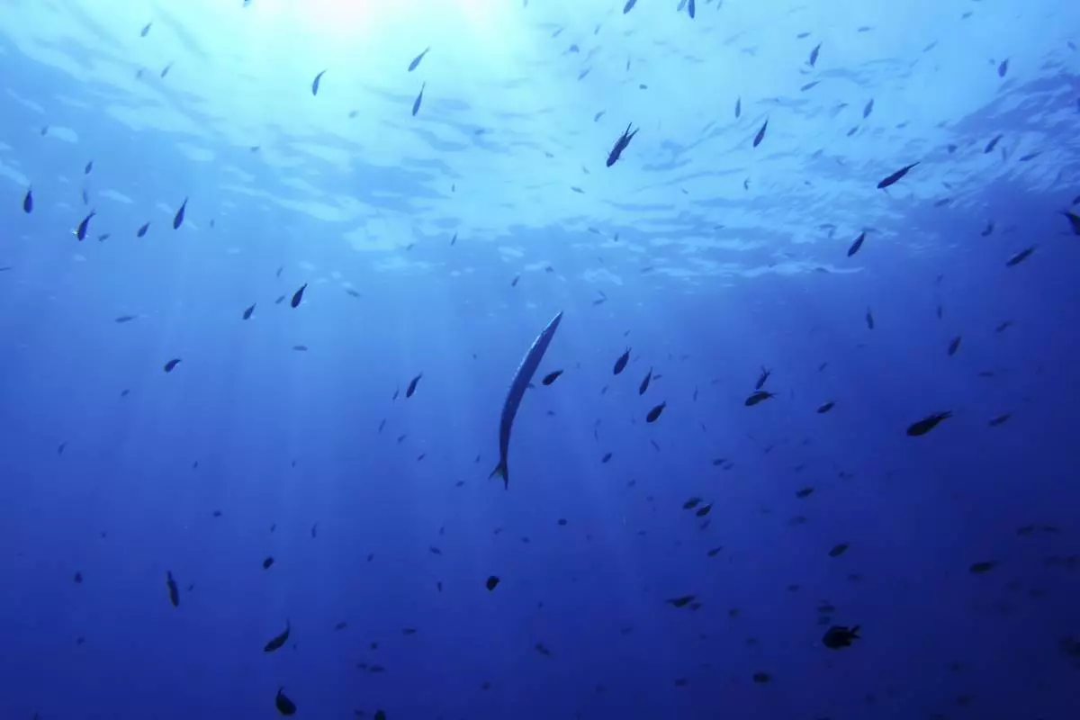 A barracuda, center, swims in the protected area of France's Porquerolles National Park ahead of the U.N. Ocean Conference on Friday, June 6, 2025. (AP Photo/Annika Hammerschlag)
