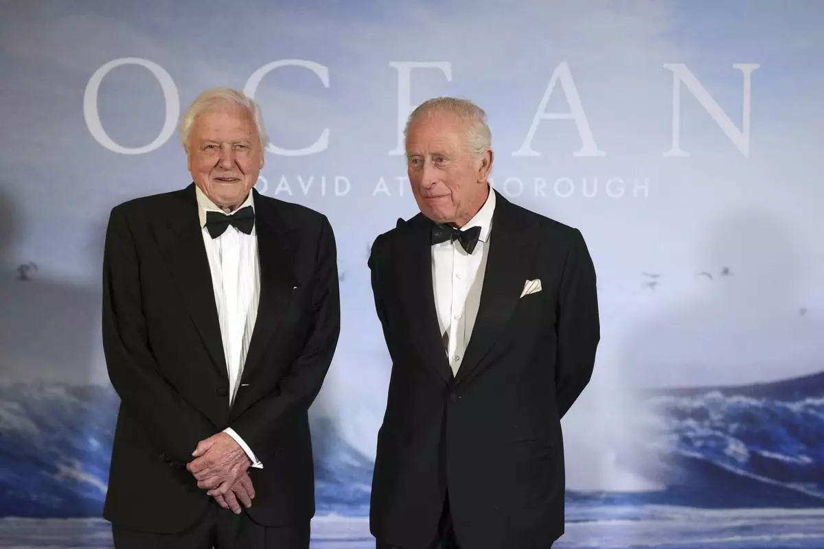 FILE - Britain's King Charles III meets broadcaster and biologist David Attenborough, left, as he attends the "Ocean with David Attenborough" film premiere in London, May 6, 2025. (AP Photo/Alastair Grant, Pool, File)