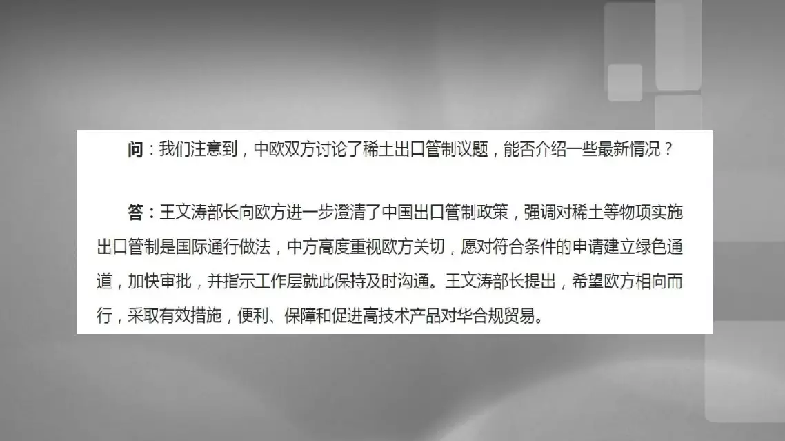 During the talks, the Chinese side further clarified China's export control policies, emphasizing that such controls on rare earths and other items are in line with common international practices.