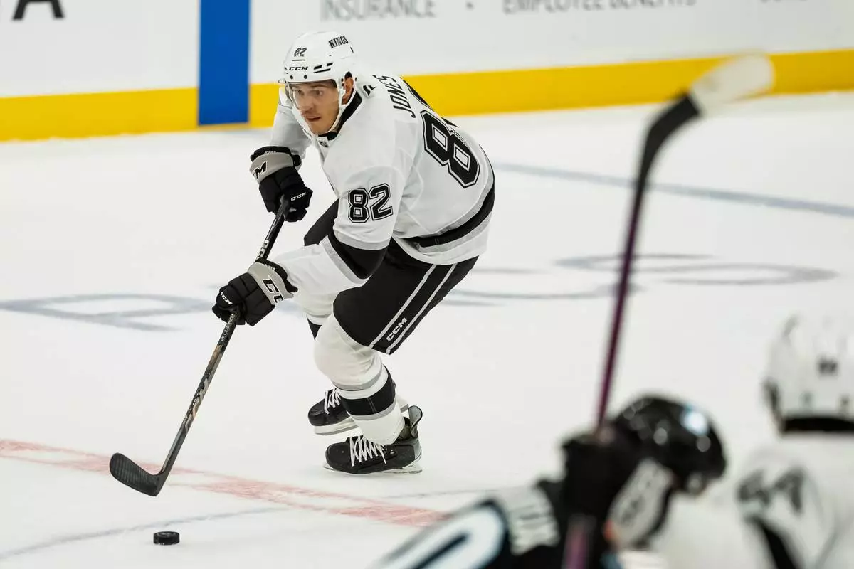 FILE - Los Angeles Kings defenseman Caleb Jones (82) moves the puck during the first period of a preseason NHL hockey game against the Utah Hockey Club, Monday, Sept. 23, 2024, in Salt Lake City. (AP Photo/Spenser Heaps)