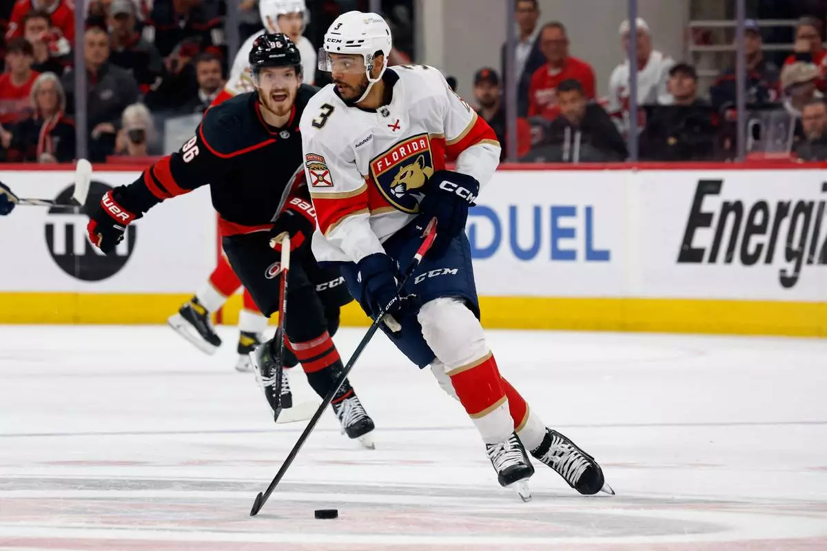 FILE - Florida Panthers' Seth Jones (3) skates against the Carolina Hurricanes during the first period of Game 1 of the NHL hockey Stanley Cup Eastern Conference finals in Raleigh, N.C., Tuesday, May 20, 2025. (AP Photo/Karl DeBlaker)