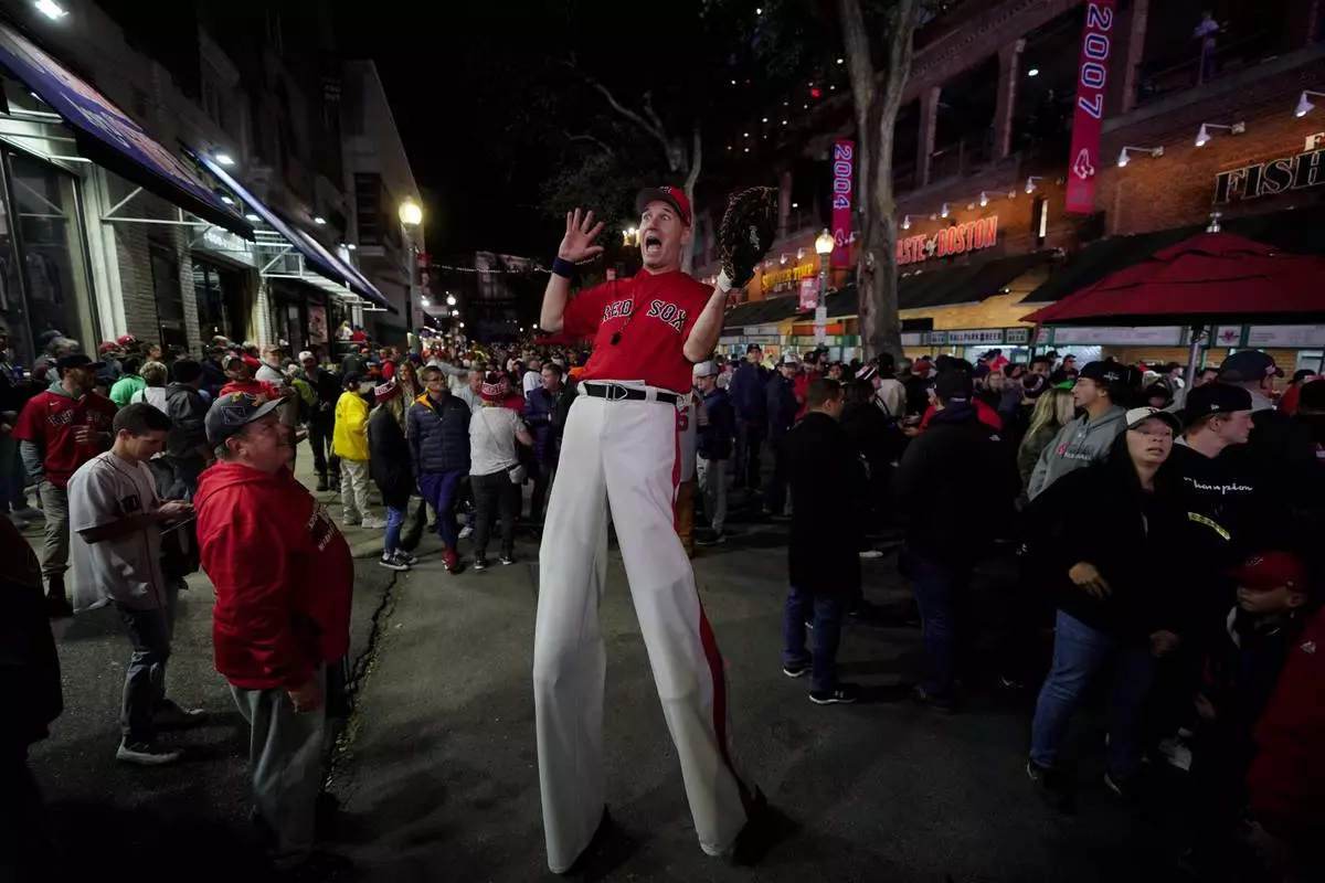 FILE-A street performer entertains the crowd outside Fenway Park in this Oct. 19, 2021 file photo in Boston.(AP Photo/Robert F. Bukaty, files)