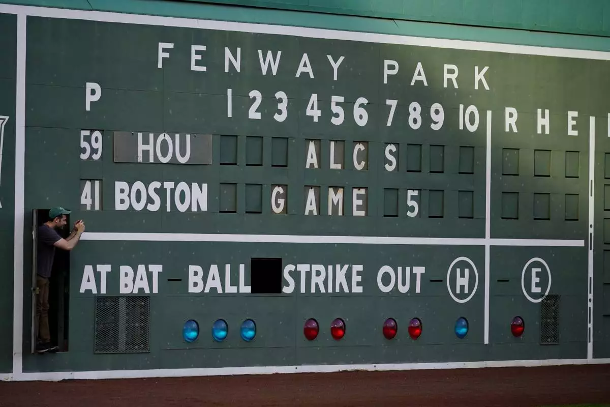A scoreboard worker takes a picture before a game in this Oct. 20, 2021 file photo, in Boston. (AP Photo/Robert F. Bukaty)