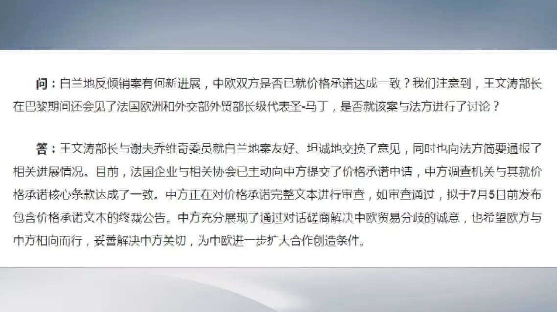 Regarding the anti-dumping investigation into brandy, French companies and relevant associations had proactively submitted applications on price commitments to China, and the Chinese investigating authorities had reached an agreement with them on the core terms of the price commitments, the ministry said in its statement.