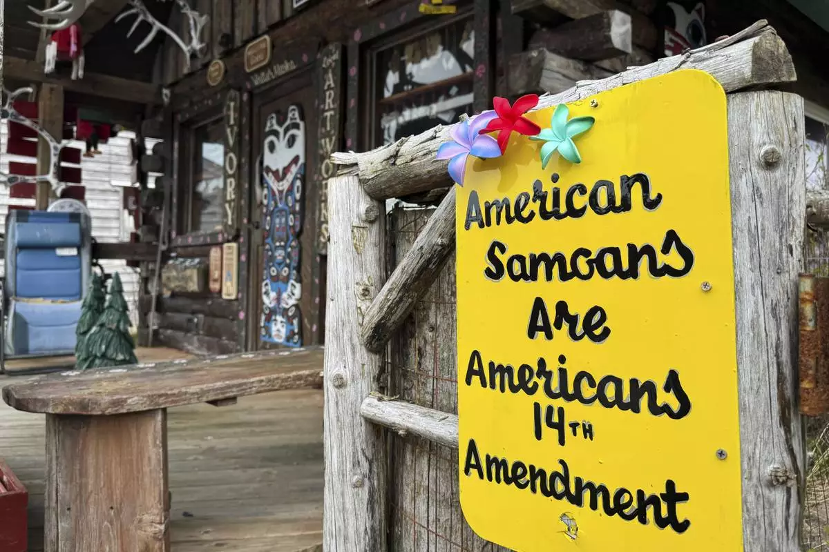 A sign supporting citizenship for American Samoans is posted outside the Log Cabin Gifts store on the waterfront in Whittier, Alaska, May 13, 2025. (AP Photo/Mark Thiessen)