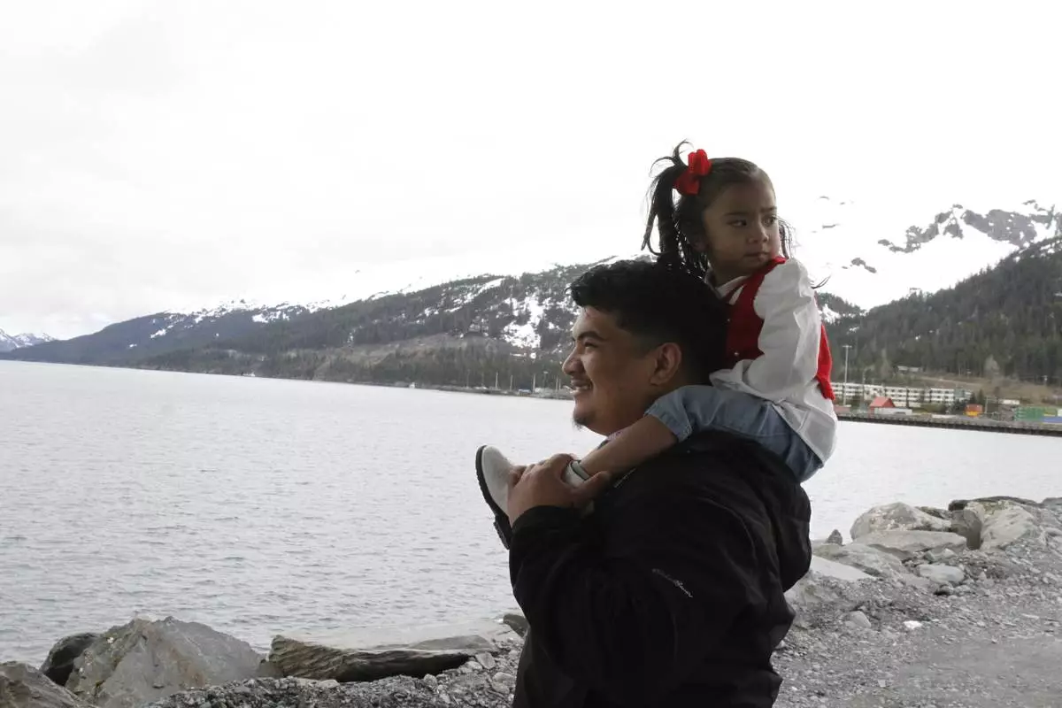 Michael Pese and his daughter Cataleya survey Blackstone Bay in Whittier, Alaska, May 13, 2025. (AP Photo/Mark Thiessen)