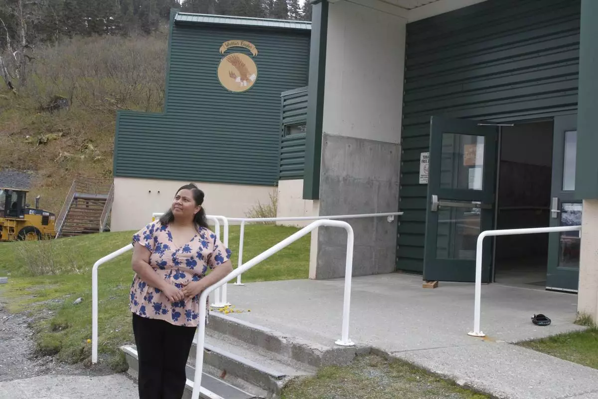 Tupe Smith poses for a photo outside the school in Whittier, Alaska, May 13, 2025. She was elected to the school board in 2023 but a week later was told she could not serve because as a native of American Samoa, she is a U.S. national but not a U.S. citizen. (AP Photo/Mark Thiessen)
