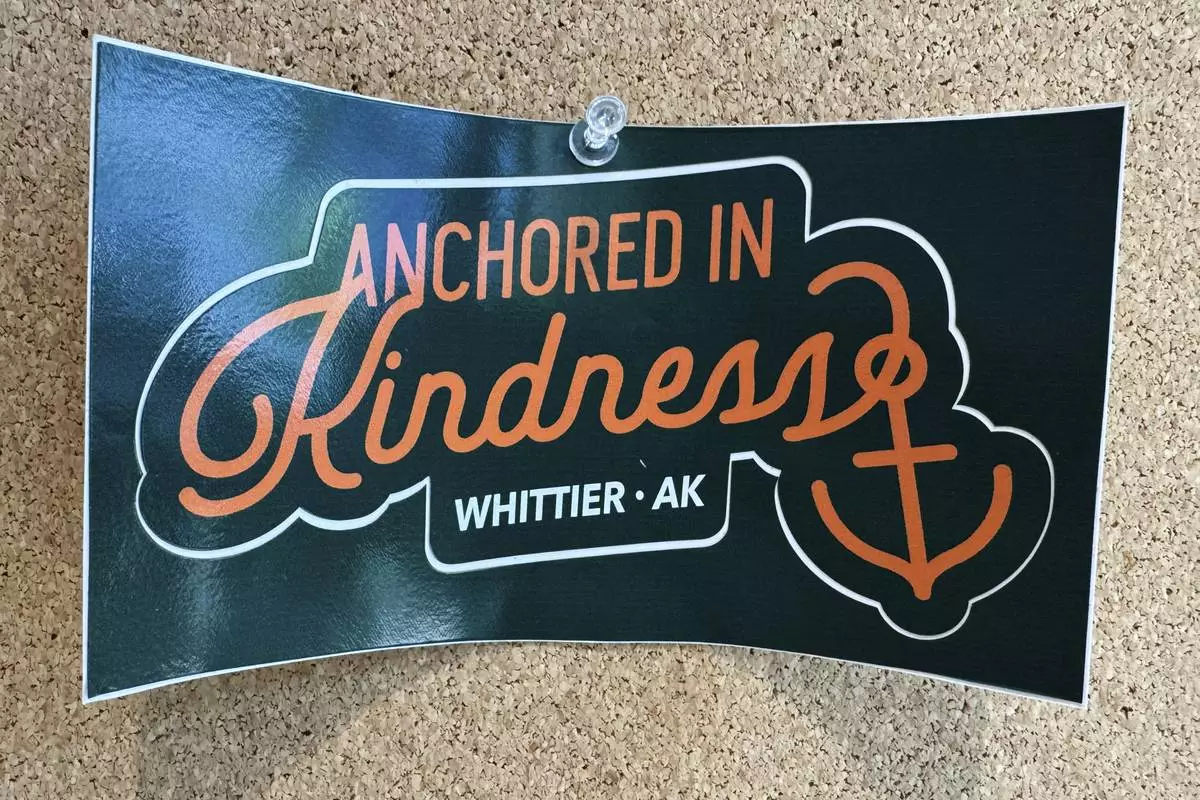 A poster with the slogan "Anchored in Kindness, Whittier, AK" is displayed in the city building in Whittier, Alaska, May 13, 2025. (AP Photo/Mark Thiessen)