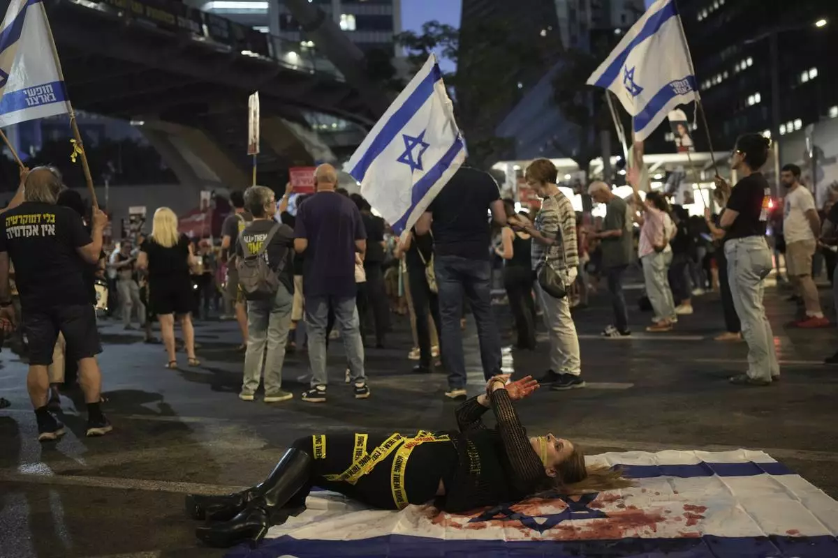 A demonstrator takes part in a performance during a protest against Prime Minister Benjamin Netanyahu's government and call for the release of hostages held in the Gaza Strip by the Hamas militant group, in Tel Aviv, Israel, Saturday, June 7, 2025. (AP Photo/Ohad Zwigenberg)