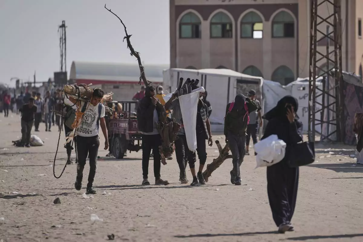 Displaced Palestinians carrying wood and other items in Rafah, southern Gaza Strip on Saturday, June 7, 2025. (AP Photo/Jehad Alshrafi)