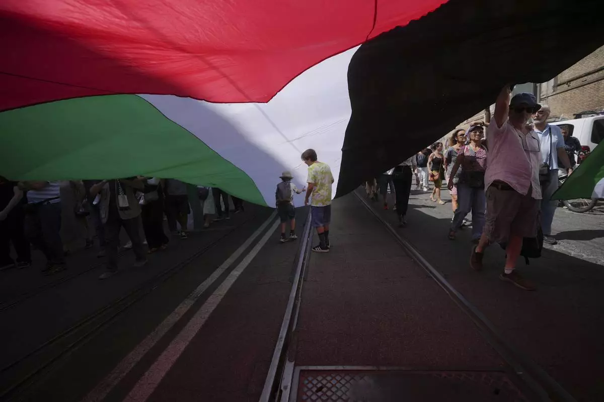 Protesters gather for a pro-Palestinian demonstration in Rome, Saturday, June 7, 2025. (AP Photo/Alessandra Tarantino)