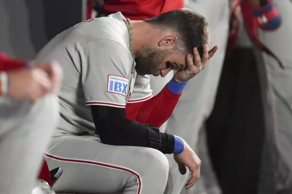 Philadelphia Phillies' Bryce Harper (3) sits in the dug out after losing to the Toronto Blue Jays in a baseball game in Toronto, Thursday, June 5, 2025. (Chris Young/The Canadian Press via AP)