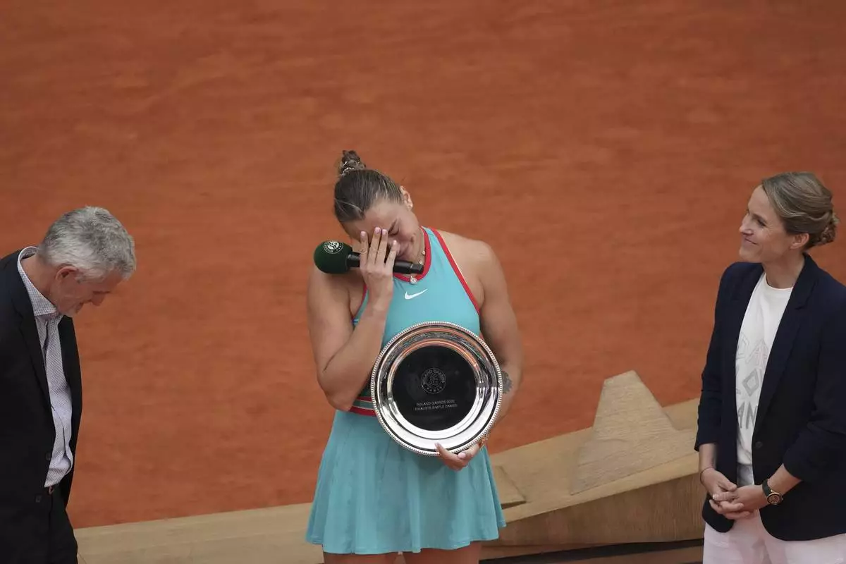 Second placed Aryna Sabalenka of Belarus reacts with her trophy after the final match of the French Tennis Open against winner Coco Gauff of the U.S. at the Roland-Garros stadium in Paris, Saturday, June 7, 2025. (AP Photo/Christophe Ena)