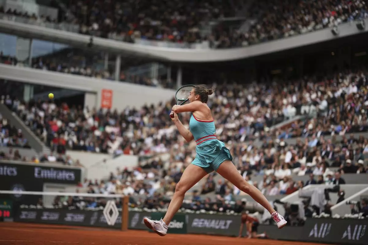 Aryna Sabalenka of Belarus plays a shot against Coco Gauff of the U.S. during their final match of the French Tennis Open at the Roland-Garros stadium in Paris, Saturday, June 7, 2025. (AP Photo/Christophe Ena)