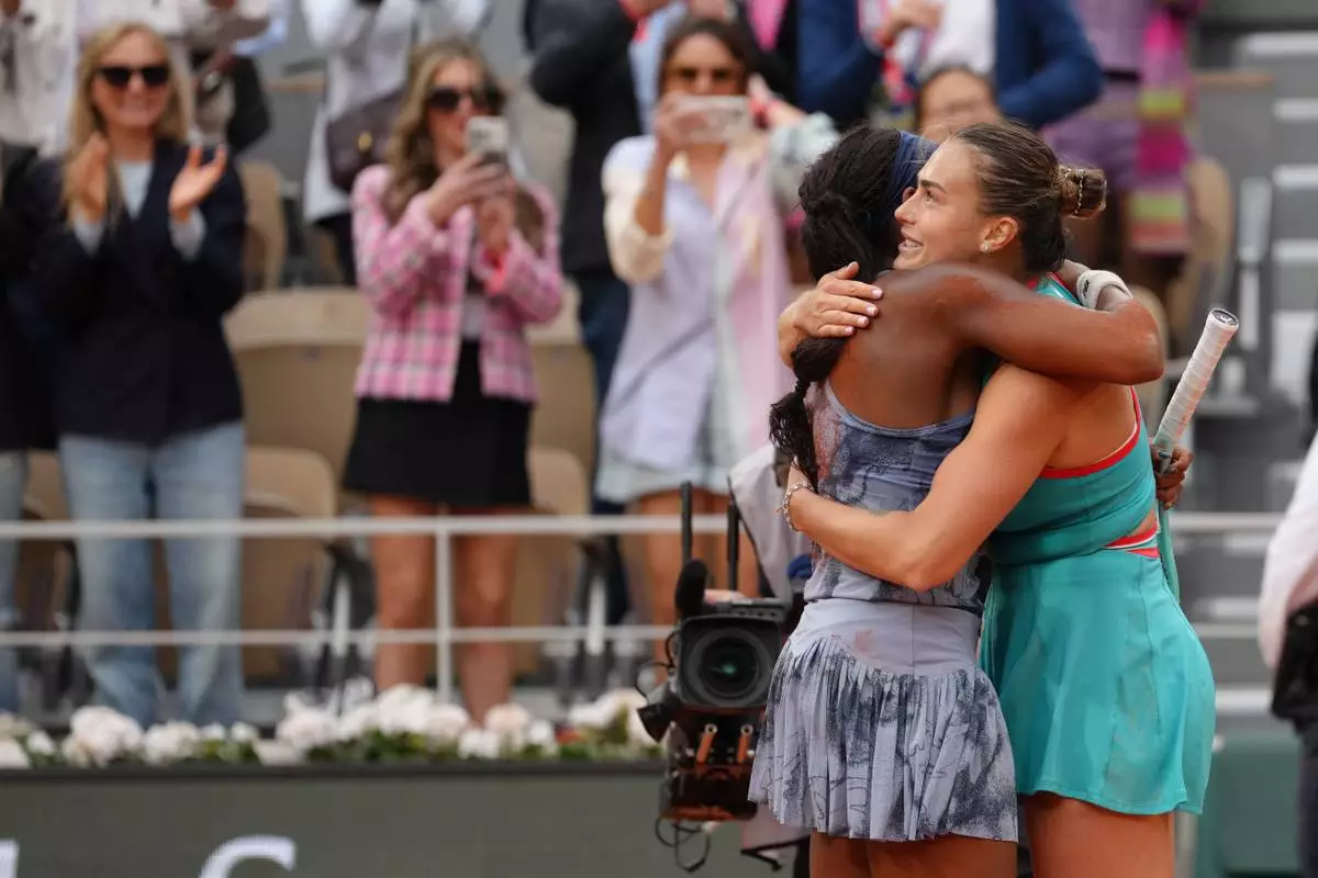 Winner Coco Gauff of the U.S., left, and Aryna Sabalenka of Belarus hug after their final match of the French Tennis Open at the Roland-Garros stadium in Paris, Saturday, June 7, 2025. (AP Photo/Aurelien Morissard)
