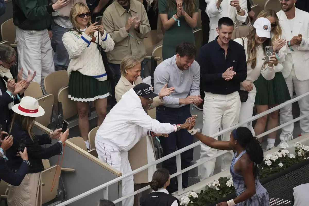 Winner Coco Gauff of the U.S. shakes hands with Spike Lee after the final match of the French Tennis Open against Aryna Sabalenka of Belarus at the Roland-Garros stadium in Paris, Saturday, June 7, 2025. (AP Photo/Christophe Ena)