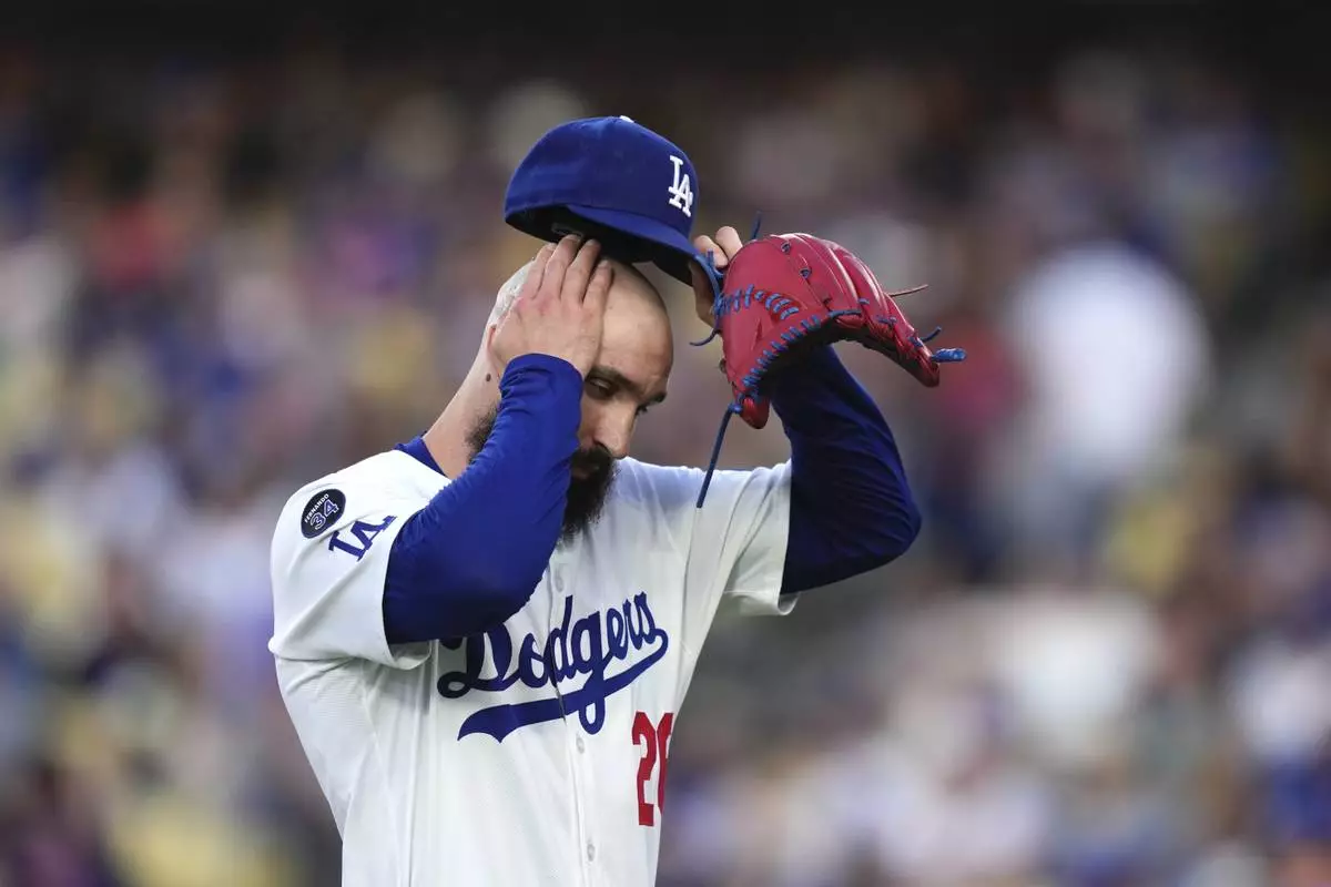Los Angeles Dodgers starting pitcher Tony Gonsolin wipes his head as he walks off the fields after the top of the first inning of a baseball game against the New York Mets, Wednesday, June 4, 2025, in Los Angeles. (AP Photo/Mark J. Terrill)
