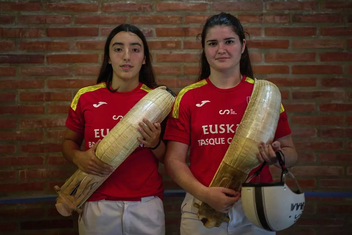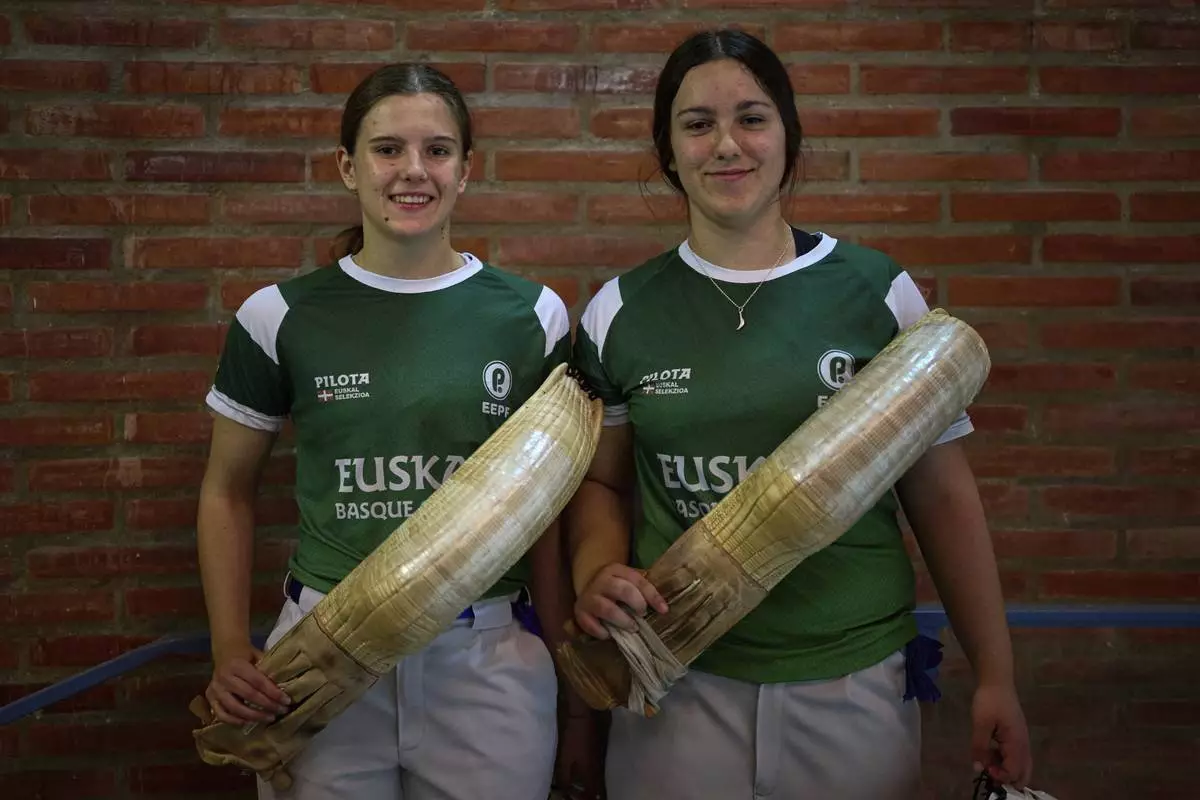 Arai Lejardi, right, competes next to her teammate Erika Mugartegui, members of the Spanish national team, at the Jai Alai fronton during the Nations League match between the Euskadi national team and the Spanish national team at the Jai Alai fronton in Guernica-Luno, northern Spain, Friday, June 6, 2025. (AP Photo/Miguel Oses)