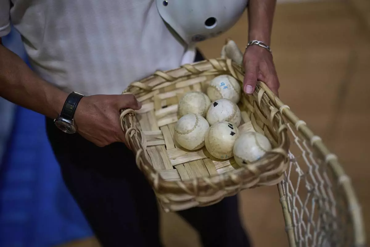 Jai Alai balls are pictured prior to the start of the Nations League match between the Spanish national team and the Euskadi national team at the Jai Alai fronton in Guernica-Luno, northern Spain, Friday, June 6, 2025. (AP Photo/Miguel Oses)