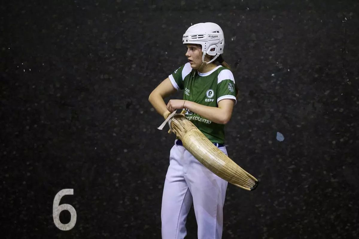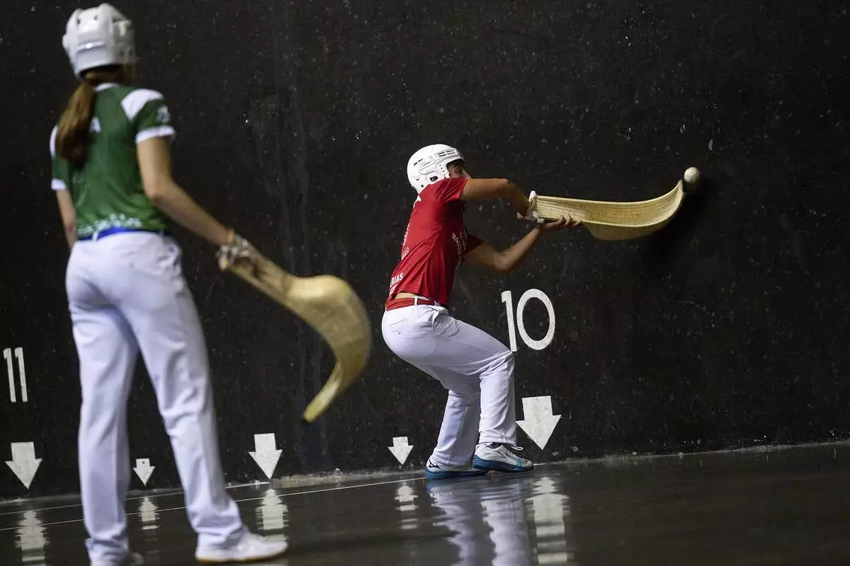 Elaia Gogenola, a member of the Euskadi national team, competes with her teammate Maia Goikoetxea during the Nations League match between the Spanish national team and the Euskadi national team at the Jai Alai fronton in Guernica-Luno, northern Spain, Friday, June 6, 2025. (AP Photo/Miguel Oses)