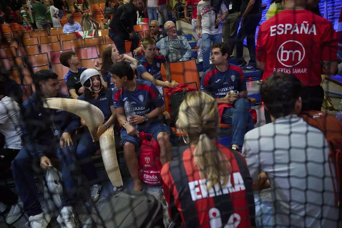 People react during the Nations League match between the Spanish national team and the Euskadi national team at the Jai Alai fronton in Guernica-Luno, northern Spain, Friday, June 6, 2025. (AP Photo/Miguel Oses)