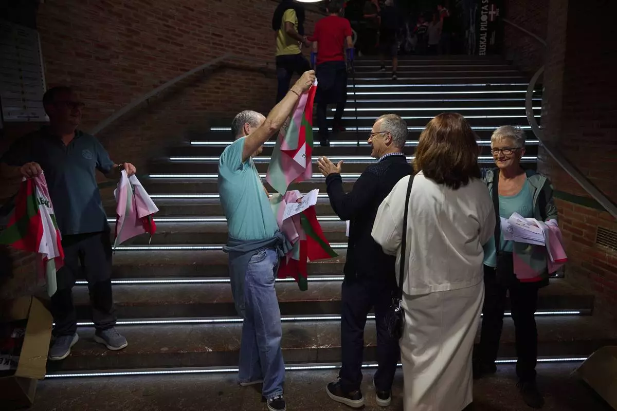 A man receives a Basque flag, or "Ikurrina," ahead of the Nations League match between the Euskadi national team and the Spanish national team at the Jai Alai fronton in Guernica-Luno, northern Spain, Friday, June 6, 2025. (AP Photo/Miguel Oses)