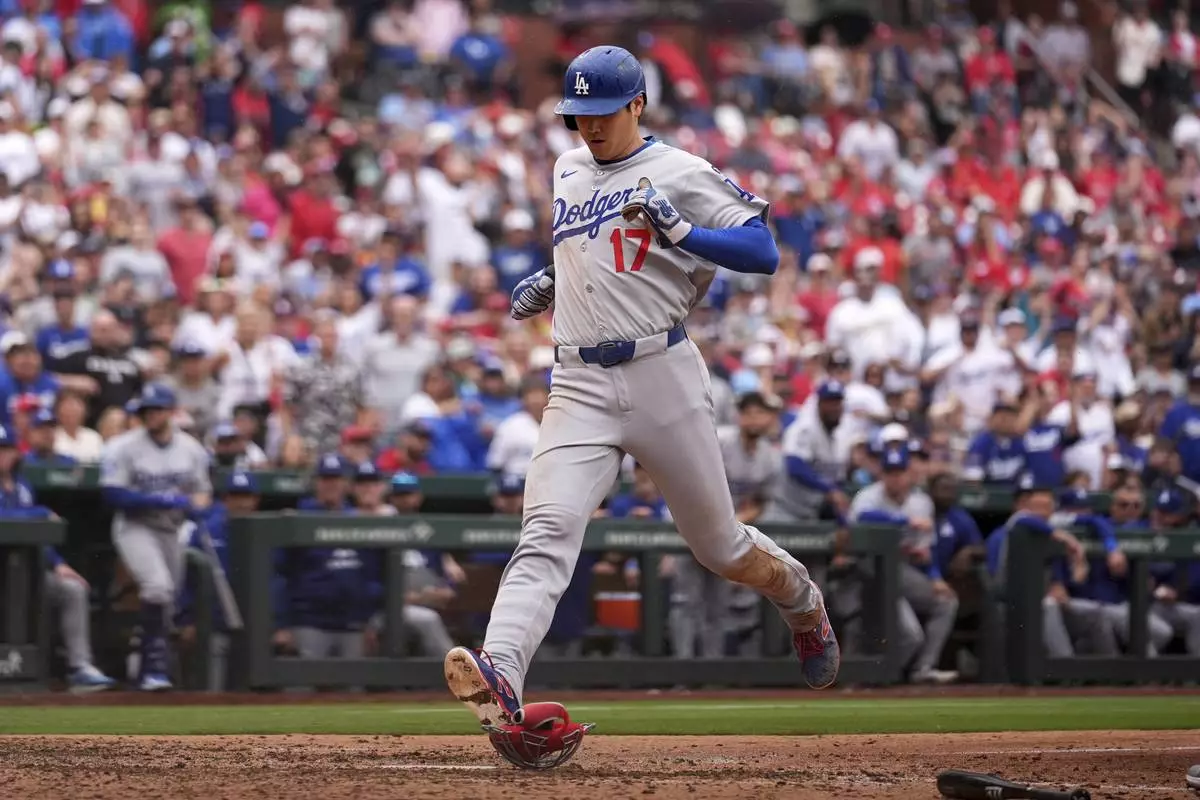 Los Angeles Dodgers' Shohei Ohtani scores on a wild pitch by St. Louis Cardinals pitcher Ryan Helsley during the ninth inning of a baseball game Saturday, June 7, 2025, in St. Louis. (AP Photo/Jeff Roberson)
