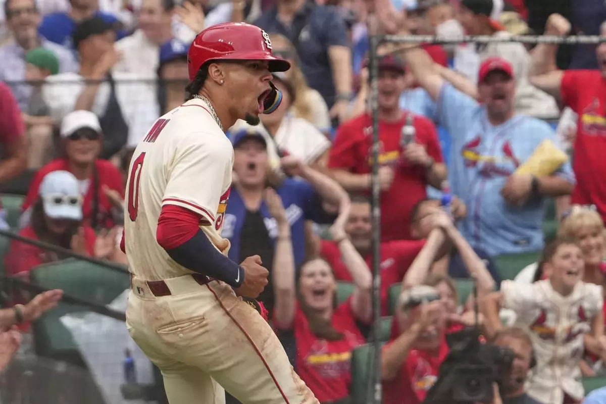 St. Louis Cardinals' Masyn Winn celebrates after scoring during the eighth inning of a baseball game against the Los Angeles Dodgers Saturday, June 7, 2025, in St. Louis. (AP Photo/Jeff Roberson)