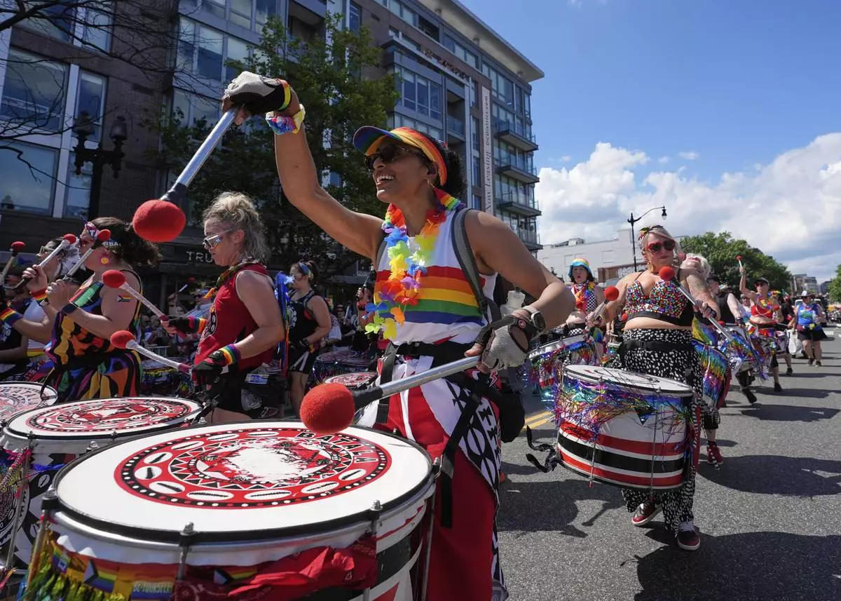 Members of Batalá Washington D.C. perform during the World Pride parade, Saturday, June 7, 2025, in Washington. (AP Photo/Alex Brandon)