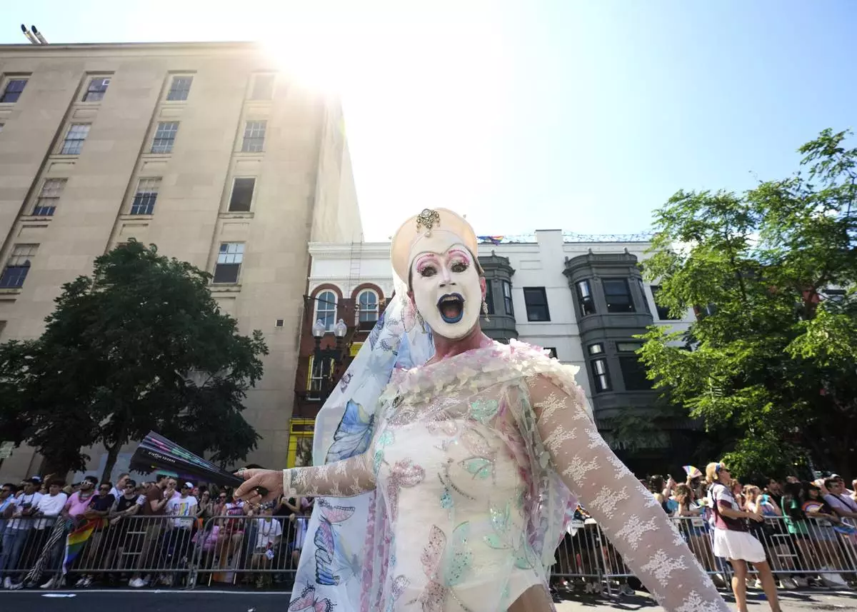 Along the parade route, hundreds gathered outside the National City Christian Church as rainbow flags and balloons lined its steps and columns. A child with rainbow face paint blew bubbles at the base of the steps while Whitney Houston’s “I Wanna Dance with Somebody” blared from loudspeakers.
