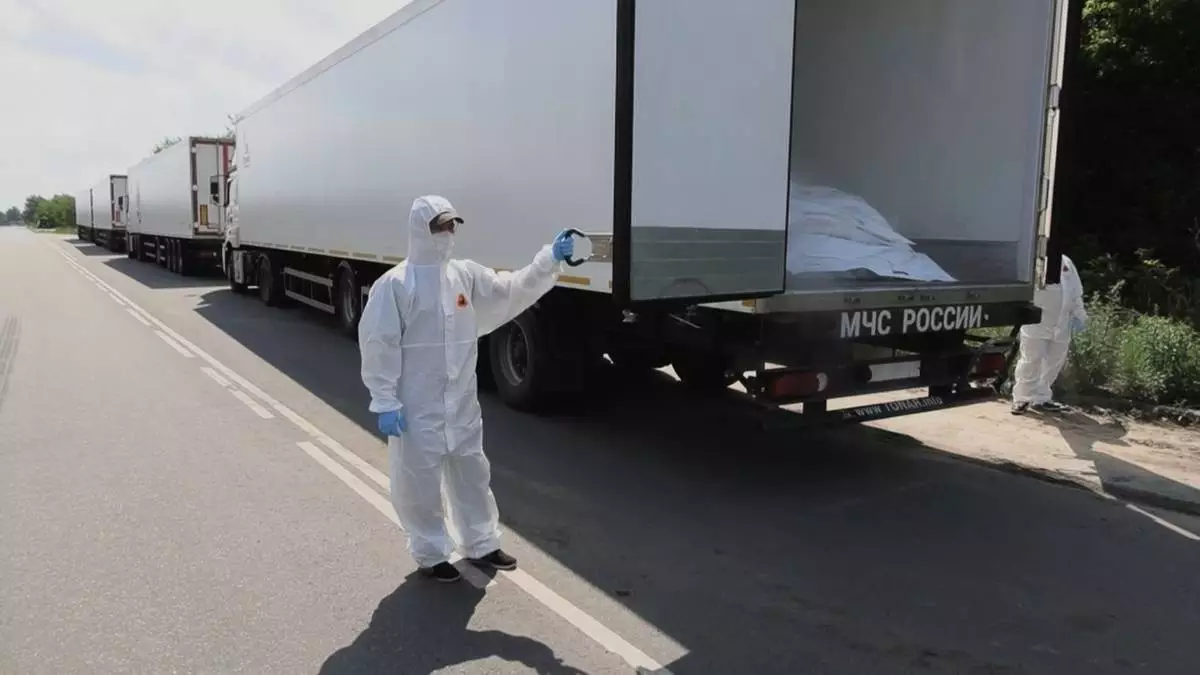 In this photo, taken from video distributed by Russian Defense Ministry Press Service on Sunday, June 8, 2025, orderlies shows an open refrigerator of the first convoy, carrying bodies of Ukrainian soldiers for repatriation, at an exchange area near Novaya Guta, Belarus, for the beginning of a large-scale exchange between Russia and Ukraine. (Russian Defense Ministry Press Service via AP)
