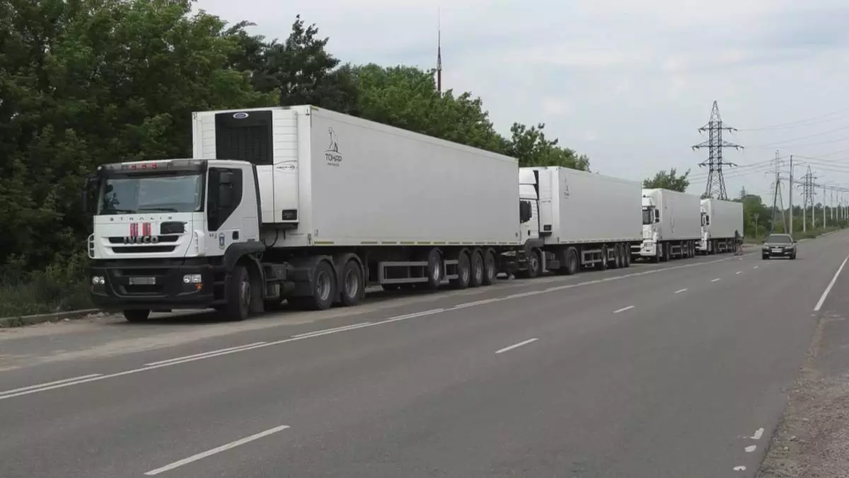 In this photo, taken from video distributed by Russian Defense Ministry Press Service on Sunday, June 8, 2025, the motorcade of refrigerators of the first convoy carrying bodies of Ukrainian soldiers for repatriation is parked at an exchange area near Novaya Guta, Belarus, for the beginning of a large-scale exchange between Russia and Ukraine. (Russian Defense Ministry Press Service via AP)