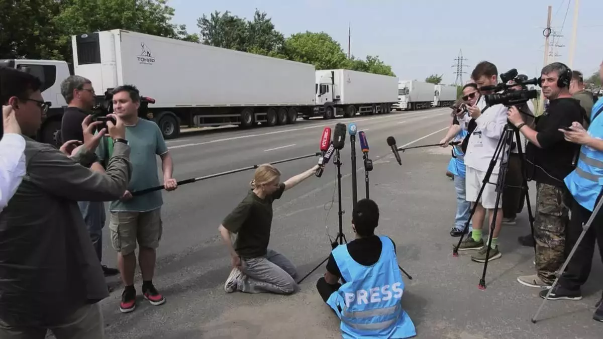 In this photo, taken from video distributed by Russian Defense Ministry Press Service on Sunday, June 8, 2025, Journalists gather near the motorcade of refrigerators of the first convoy carrying bodies of Ukrainian soldiers for repatriation at an exchange area near Novaya Guta, Belarus, for the beginning of a large-scale exchange between Russia and Ukraine. (Russian Defense Ministry Press Service via AP)