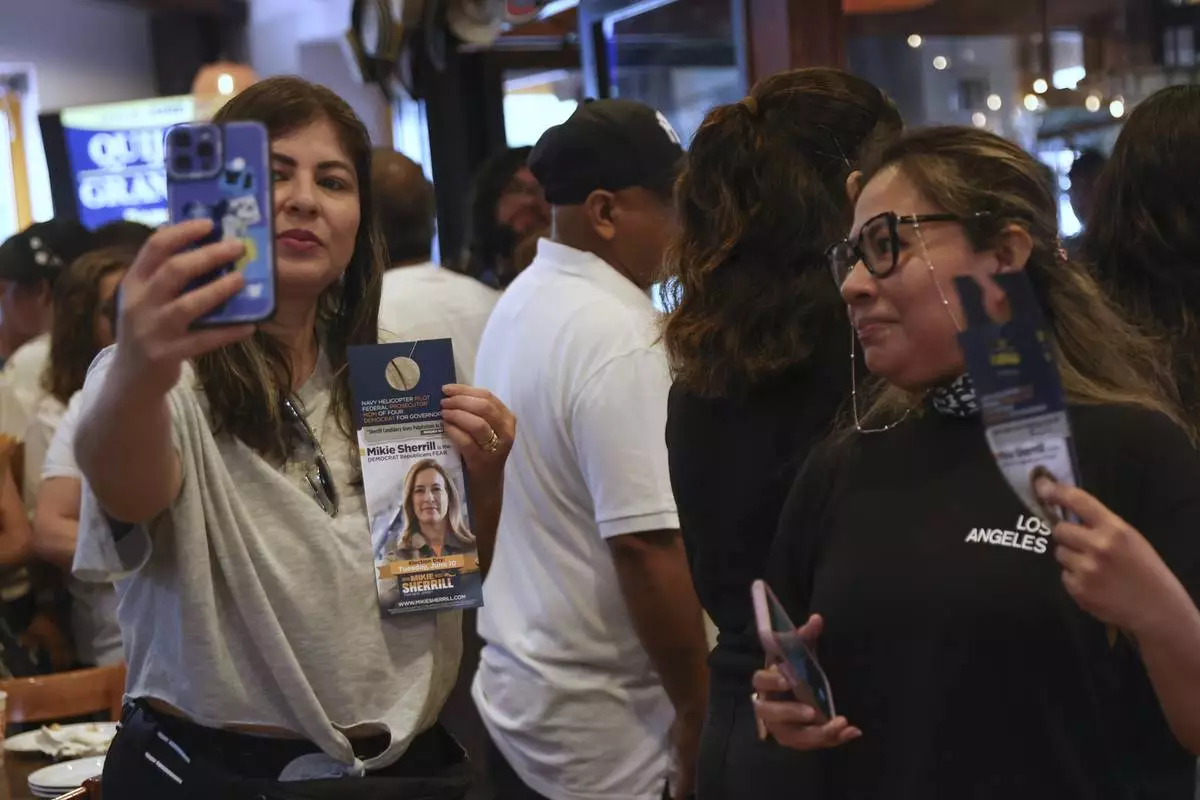 Attendees pose for photos holding a campaign pamphlet of Rep. Mikie Sherrill, D-N.J., during a "Get Out the Vote" rally, Saturday, June 7, 2025, in Elizabeth, N.J. (AP Photo/Heather Khalifa)