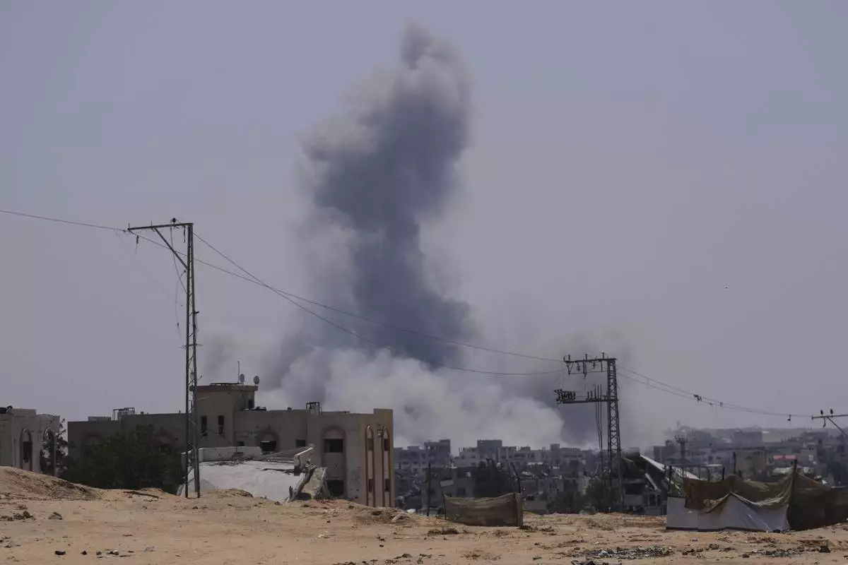 Smoke rises from an Israeli army airstrike east of Khan Younis, Gaza, Sunday, June 8, 2025. (AP Photo/Abdel Kareem Hana)